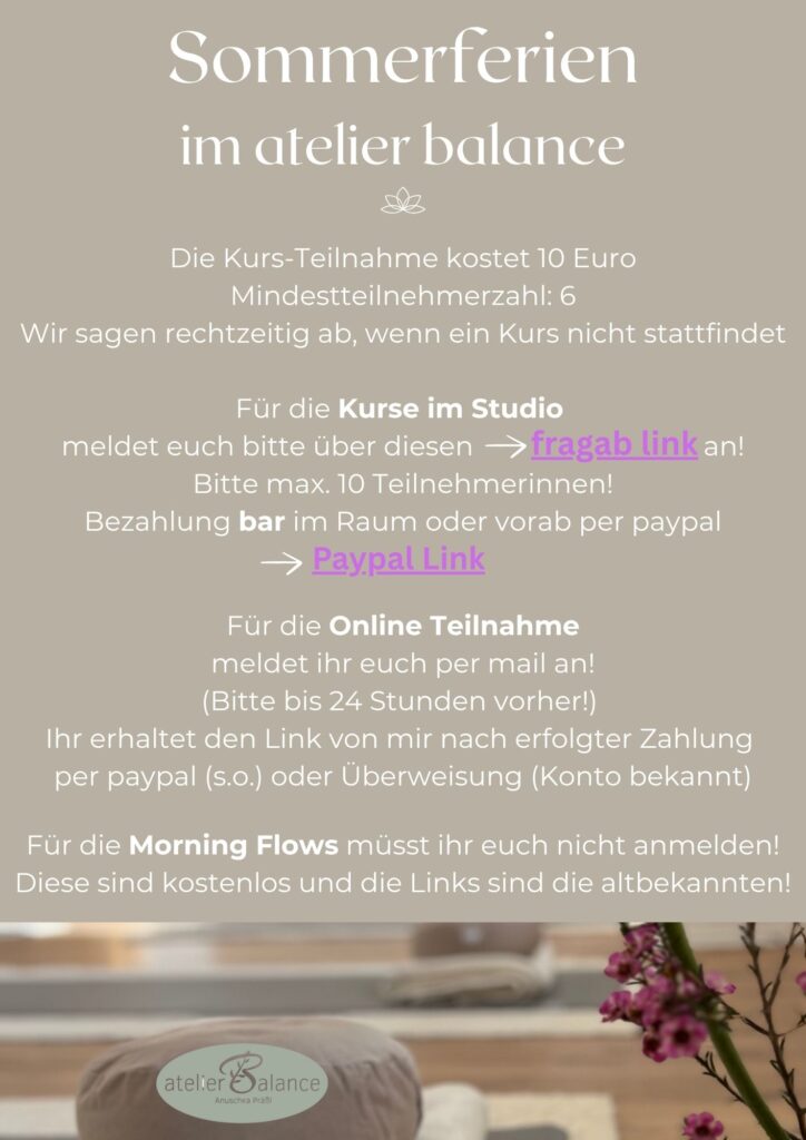 Sommerferienplan Hier findest du unseren Sommerferienplan. Wenn du an einem der Kurse teilnehmen möchtest, schreibe mir bitte über den Kontakt Button! Ich trage dich dann ein und du kannst entweder bar im Studio oder vorab per PayPal zahlen!